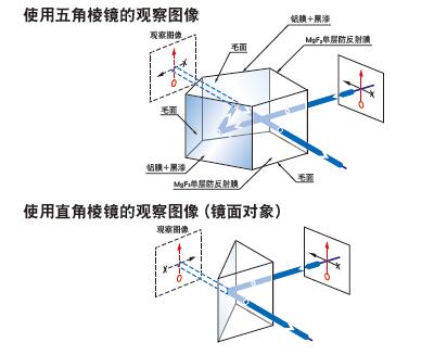 通過鏡面的2次反射,使鏡面對稱的反射圖像變換為與物體相同的正立圖像。 在照相機進化為數(shù)碼相機之前,為了使圖像不形成鏡面對稱,使用五角棱鏡將物體發(fā)出的光線直角偏轉(zhuǎn)。 也作為激光噴墨器的直角標(biāo)。